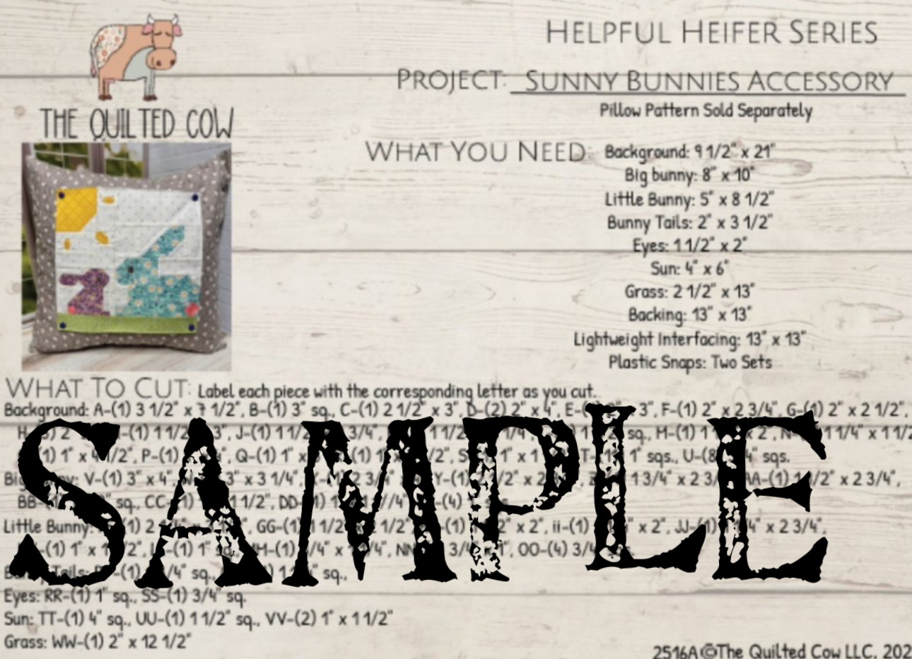 The Helpful Heifer pillow is 20" x 20". The kit includes a paper pattern, fabric and snaps for your quilted pillow.