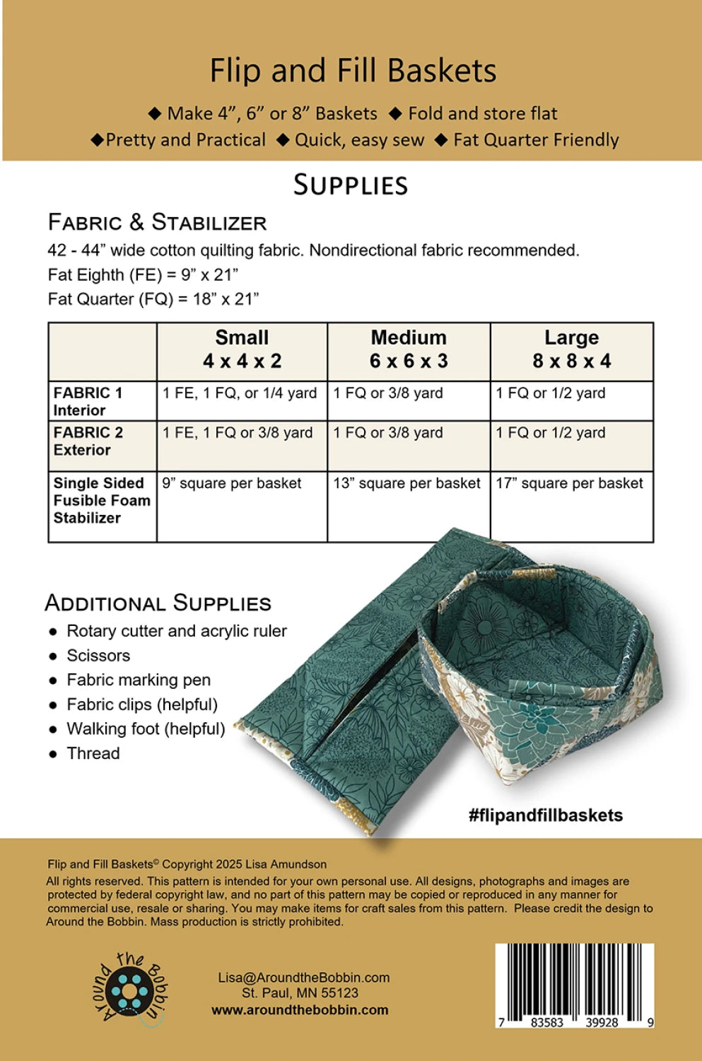 Flip and fill baskets are both pretty and functional. Designed for organizing sewing, craft or household items, these innovative baskets fold flat for convenient storage when not in use. They are simple to sew and make excellent gifts. Fat quarter friendly. Makes 3 sizes – 4 in, 6 in and 8 in baskets.