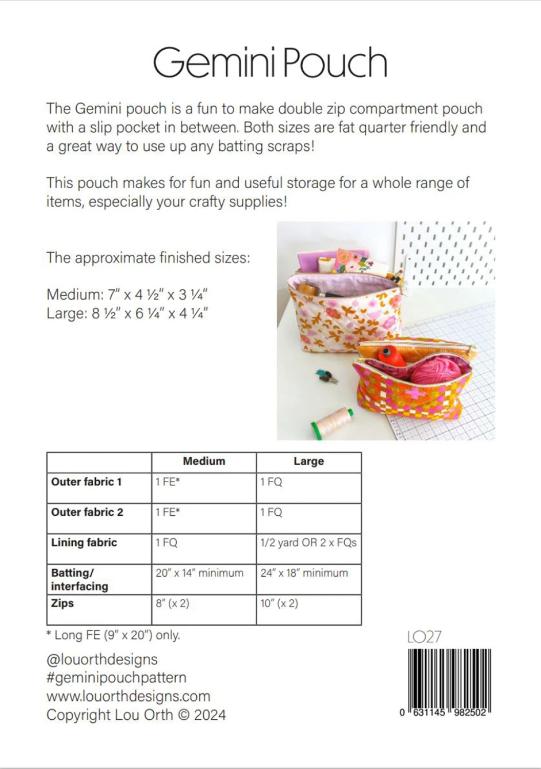 The Gemini Pouch is a fun to make double zip compartment pouch with a slip pocket in between. Both sizes of pouch are fat quarter friendly and a great way to use up any batting scraps. This pouch makes for fun and useful storage for a whole range of items, especially your craft supplies!