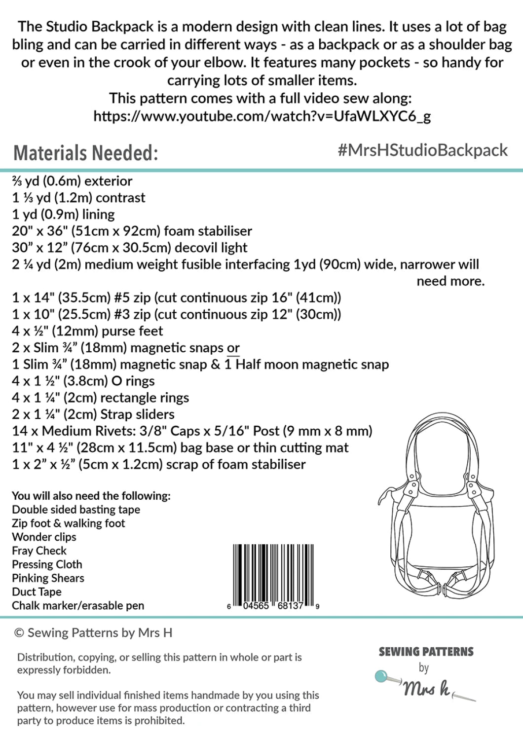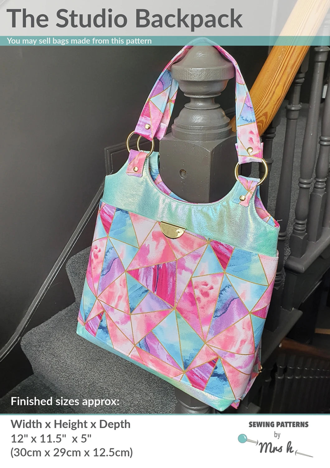 New from Sewing Patterns by Mrs H - The Studio Backpack! With a modern design and clean lines, The Studio Backpack would make a great work bag, school bag or everyday bag. The Studio Backpack uses a lot of bag bling. The adjustable backpack straps are fixed to the Studio using strap tabs securely attached (and riveted for extra security!) to O-rings at the top of the bag. Short strap handles also affixed through the O-rings give you another set of options for carrying your beautiful bag. Depending on the length you choose to make your strap handles, you could also carry The Studio on your shoulder, in the crook of your elbow, or as a tote in your hand - when you're not wearing it as a backpack, of course! No surprise - this design is packed with pockets! On the outside, two large slip pockets that are ideal for showing off fabric panels, or customising with embroidery, patchwork or a little extra bag bling. Inside, under a secure top zipper closure, there's a lovely large central space, zipper pocket, and slip pockets. Designed for adventurous beginner bagineers, The Studio Backpack bag sewing pattern includes a lot of different bagmaking skills, with comprehensive instructions to guide you through as you learn these useful techniques. For more experienced bagineers, The Studio Backpack offers excellent opportunities for customisation. You could play with patchwork, quilting or embroidery with the large outer panels, experiment with different types of hardware, or even add (even more) pockets! If you're new to adapting bag designs to fit your style, we recommend picking up a copy of Mrs H's Complete Bag Making Masterclass. Finished size: 12" wide x 11.5" high x 5" deep (30cm x 29cm x 12.5cm)